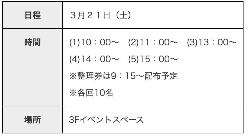 各回10名、計50名限定(9時15分から整理券配布予定)