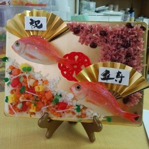 ゴールドのプレートに鯛を泳がせました